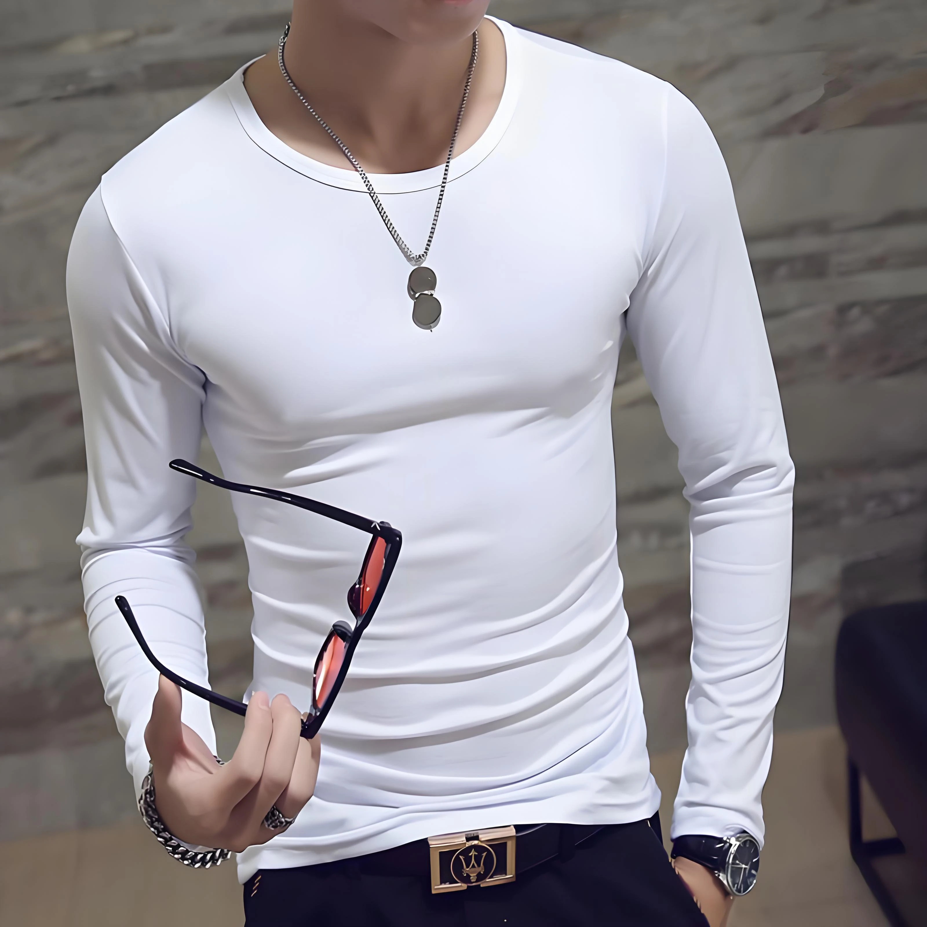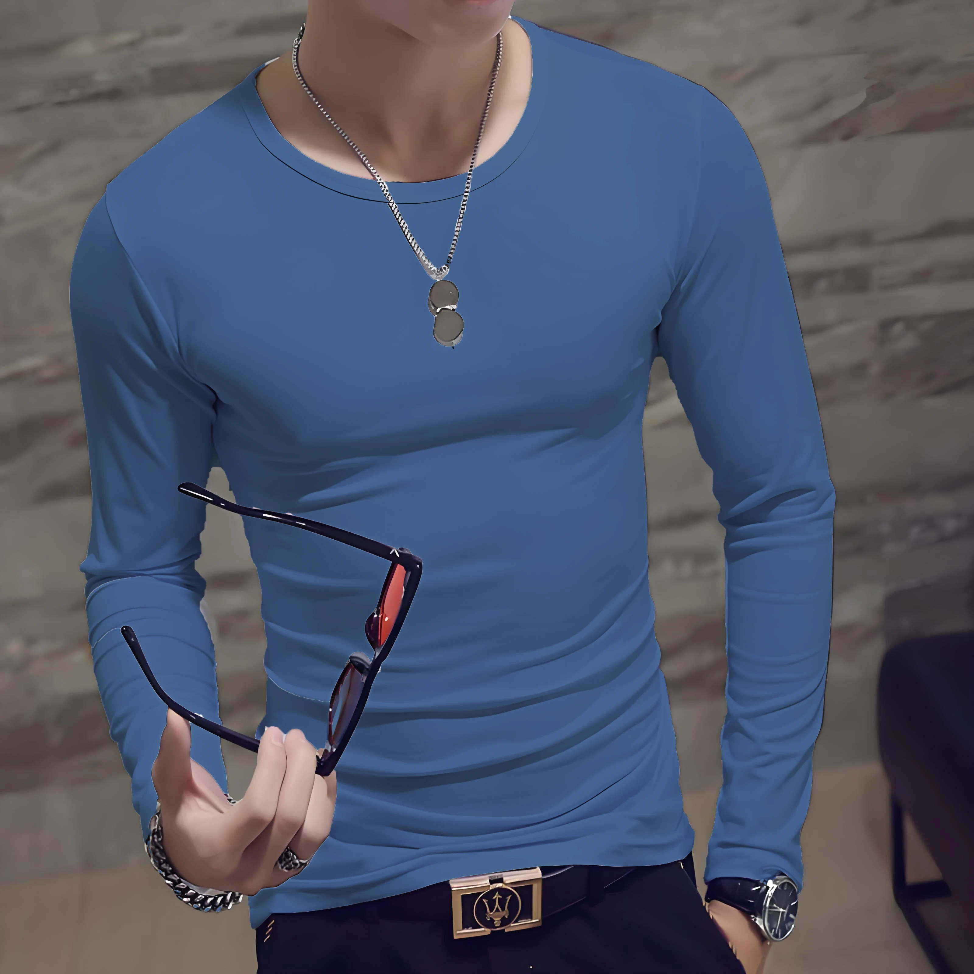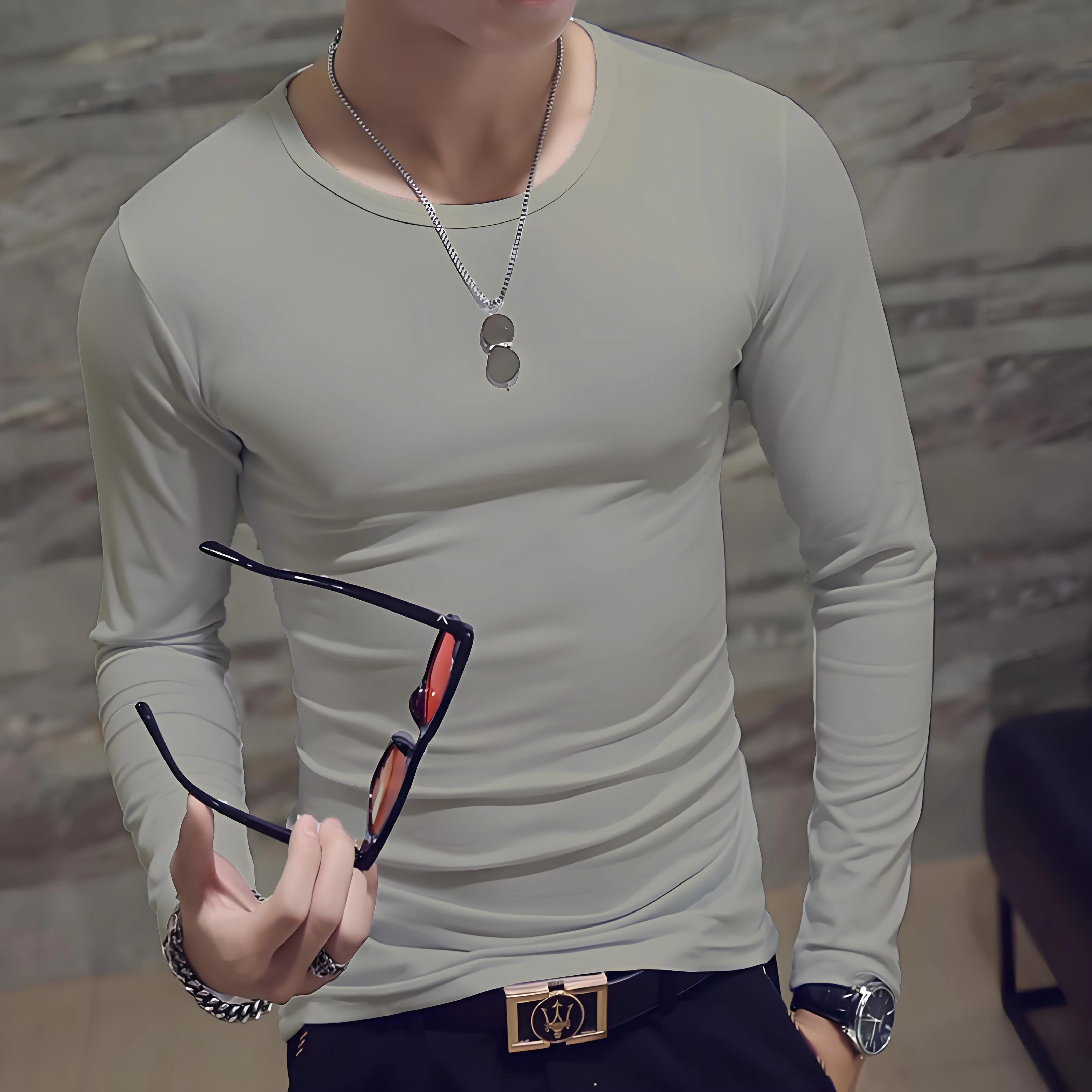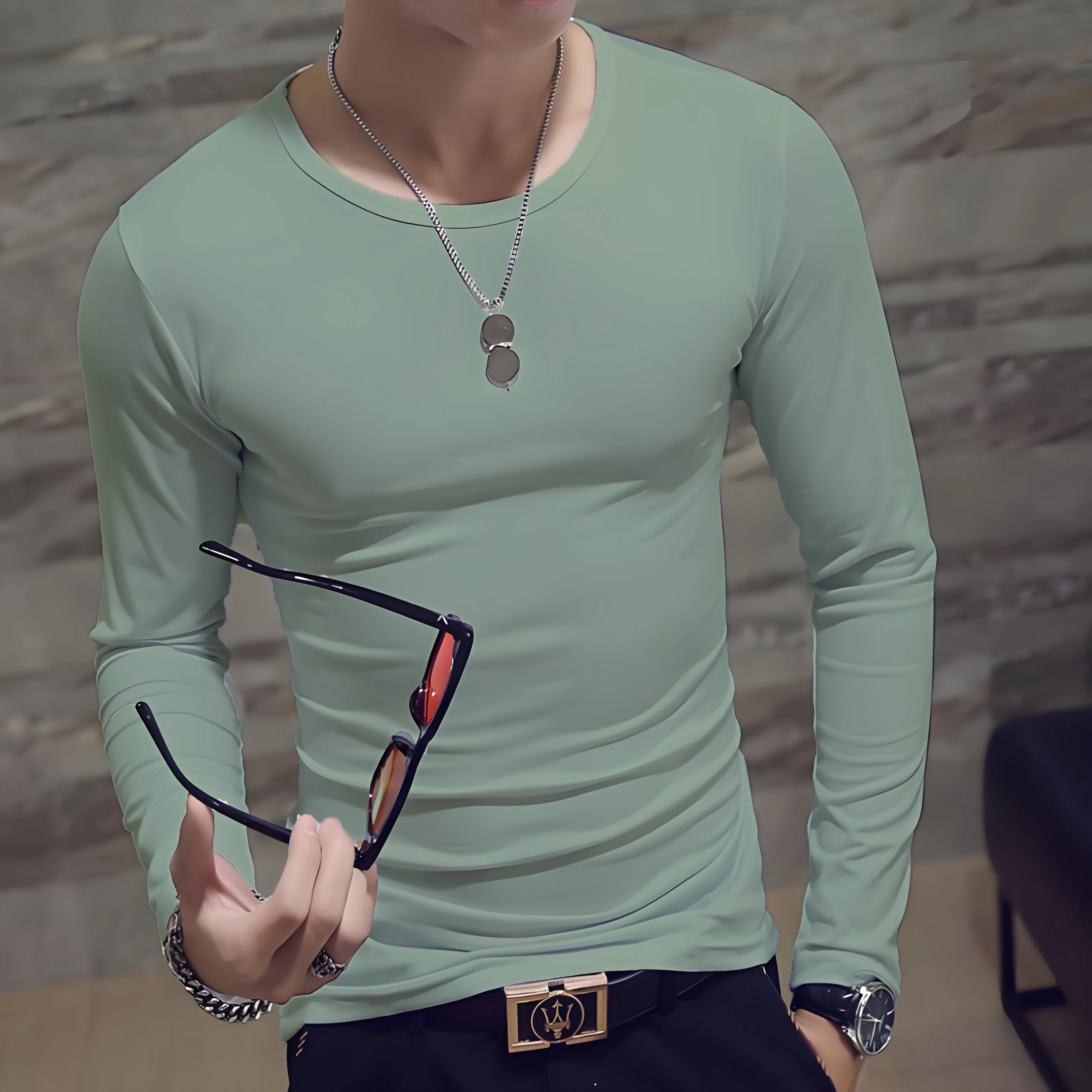 Men's casual fashion solid color long-sleeved round neck T-shirt classic men's spring and autumn thin comfortable top