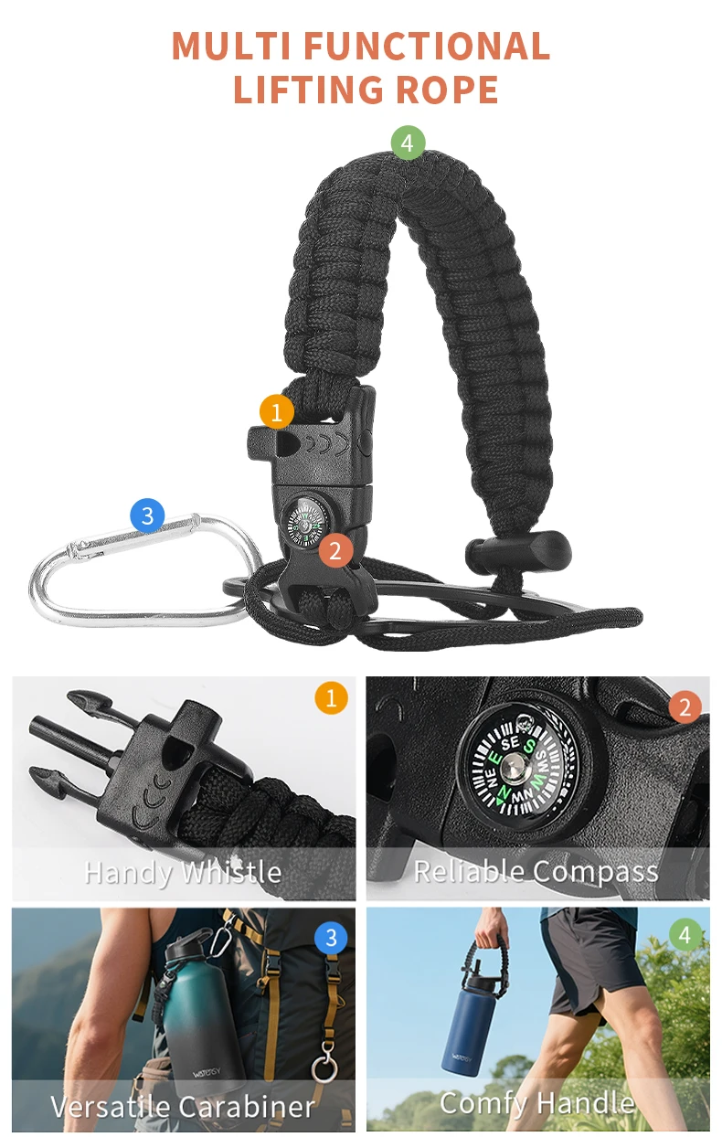 Accessories: 2 lids (straw lid and spout lid, versatile). 2 PP straws, 1 carrying bag, 1 paracord handle, 1 cleaning brush, 1 straw brush, 2 stickers.